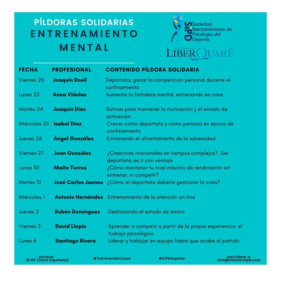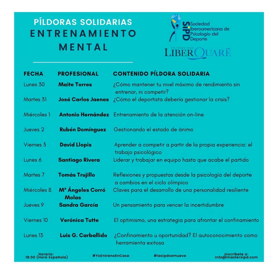 Esta iniciativa comenzó el 20 de Marzo 2020 a las 18:00 hrs de España. Una píldora solidaria de 10 minutos de entrenamiento mental en directo. Se lleva a cabo cada día con psicólogos deportivos referentes a nivel mundial.
